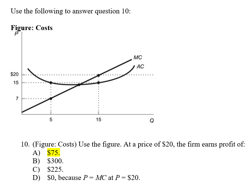 In the above question, at price 20, Revenue = 20*15 =300. Now to produce those 15 units of output, Total cost =Average cost * quantity produced =15*15 =225.Hence, Profit = total revenue -total cost = 300-225 =75.