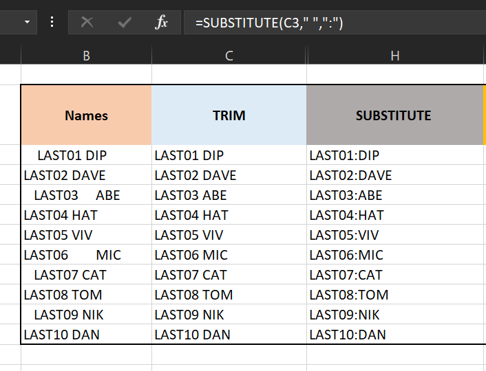 - See in the below table we have taken the original text from the column TRIM and then substituted the space between 2 words with a colon.