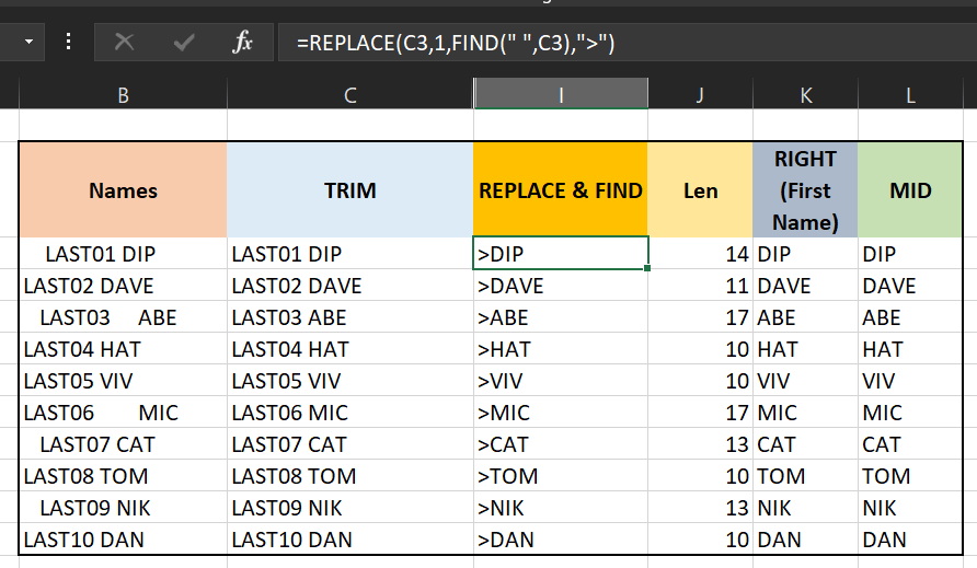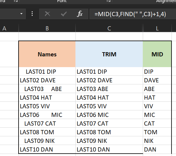 5. The MID function can also be used to extract only the name part from the column TRIM. Here we have used the FIND Function to select the text after space and also note that I have added +1 to specify to select the text after space as the function considers space as one character. After that I have mentioned 4 as 4 is the maximum length of the names provided.